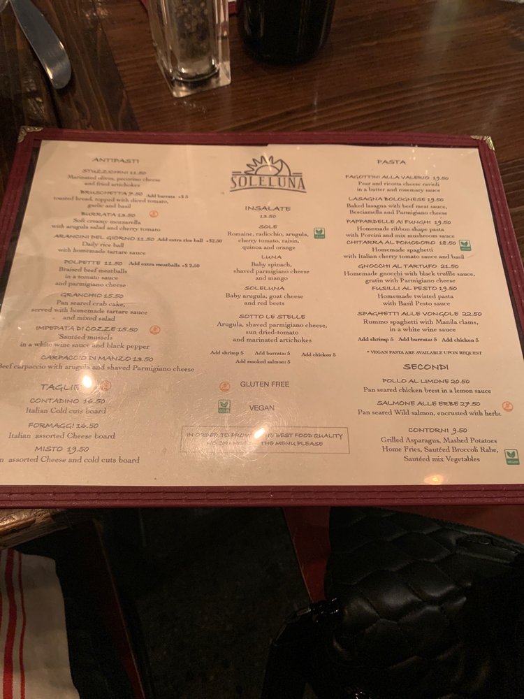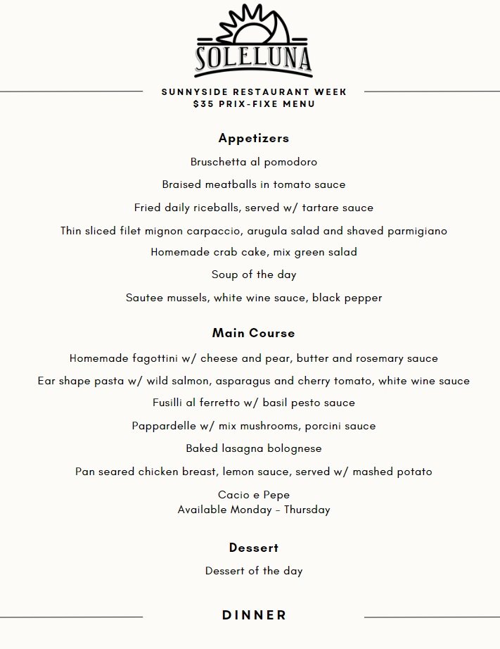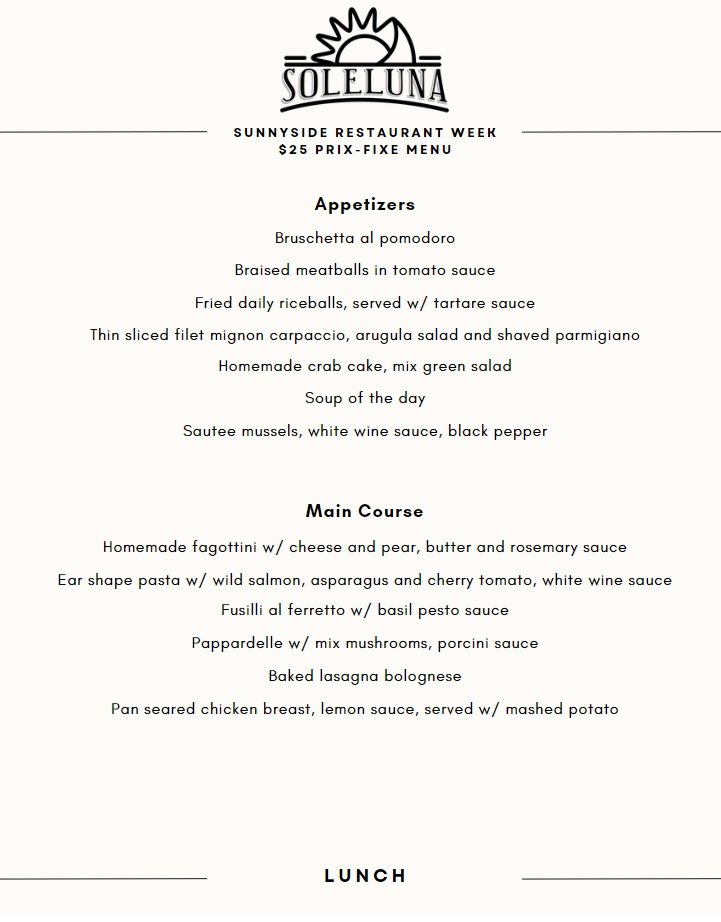 Introducing SoleLuna Restaurant, a gem in Sunnyside, NY. This cozy spot offers a variety of Italian dishes with options for vegans and limited vegetarians. From Arancini to Polpette, the Stuzzichini E Antipasti selections are a delightful start. The Pasta menu features classics like Lasagna Bolognese and innovative dishes like Gnocchi al tartufo. Customers rave about the warm ambiance and attentive service, making dining here a memorable experience. With fresh ingredients and generous portion sizes, SoleLuna Restaurant truly impresses. Don't miss out on their delicious offerings, such as the Faggotini alla Valerio and mushroom pasta. Whether you're craving pasta, pizza, or cocktails, SoleLuna Restaurant is a must-visit destination for authentic Italian cuisine in Queens.